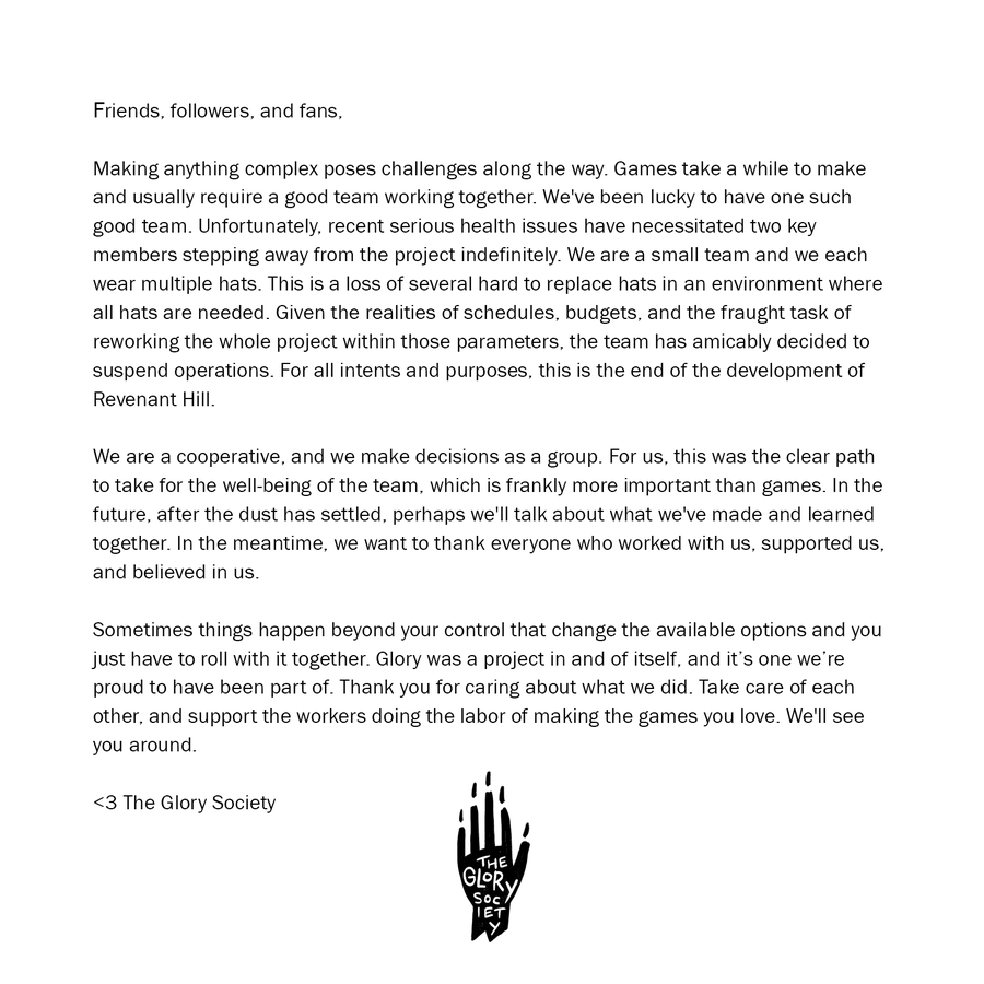 Like many fans of Night in the Woods, I was anxiously awaiting to see what the minds behind Bea, Gregg, Angus, Germ and of course, Mae, would come up with. It's disheartening that we won't get to explore the new world they had envisioned. However, my thoughts right now are not centered on Revenant Hill and what could have been, but rather on what The Glory Society team must be going through.
